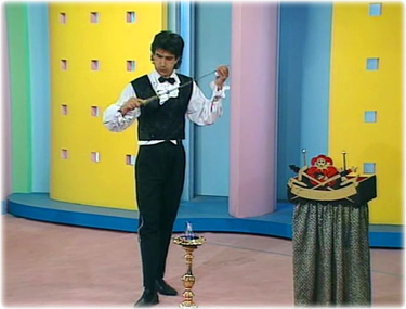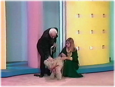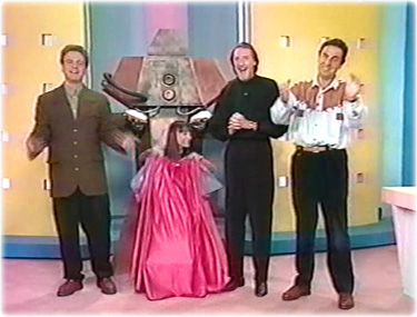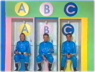 Enfin sur les côté droit et gauche du plateau sont installés grandes cloisons jaunes trouées de petits carrés. Derrière un fond bleu-gris et entre ces cloisons des colonnes roses. Ces zones du décor sont aussi celles utilisées pour les éléments des jeux Splitch, Spatch, Spotch, Vlan et l'ABC.