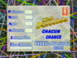 [ Synthés Chacun Sa Chance ] > Pour la nouvelle séquence télé-crochet de l'émission, sont nécéssaires quelques éléments d'habillage : le cartouche avec les numéros de téléphone pour voter (sur le même modèle que les cartouches des jeux et minitel), les synthés des prénoms des candidats et enfin ceux des résultats. Ces derniers sont générés directement par les outils de titrage en temps réel de la régie.