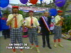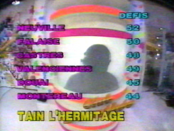 [ Les Héros dans la ville ] > Pour cette opération du mercredi matin, des éléments d'habillage sont nécessaires. Ils fonctionnent tous avec la même typographie générée en direct par la régie. Pour la liste des objets, au bas de l'écran, un bandeau violet avec typographie blanche, et pour le classement, typos colorées sur fond de cabine de Mr Cadeau. Enfin le synthé "en direct de" est en blanc et situé en bas à gauche de l'écran.